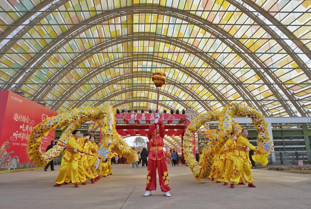 在成都新津区“村糖会”现场,当地龙灯队在饰演。新华社记者 刘坤 摄
