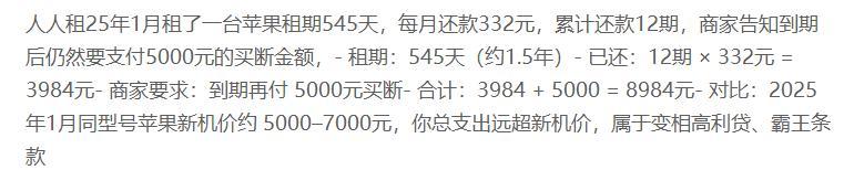 灵验户投诉称,租出苹果手机(如市价约5000-7000元或9999元的机型),最终需支付的总用度(如8984元或13906.2元)远超手机本人价值,且平台通过拆分“房钱+续期费+买断费”的形状荫藏信得过高利率,严重超出法律保护的利率上限(13.8%/年)。