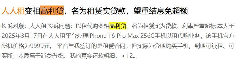 当作在线租出平台,“东说念主东说念主租”的部分业务模式激勉阛阓庸俗存眷,其“租完即送”等干事,被质疑游走于租出与金融的鸿沟,存在“名租实贷”的争议,这一争议已屡次被媒体报说念说起,且酌量滥用投诉居高不下。