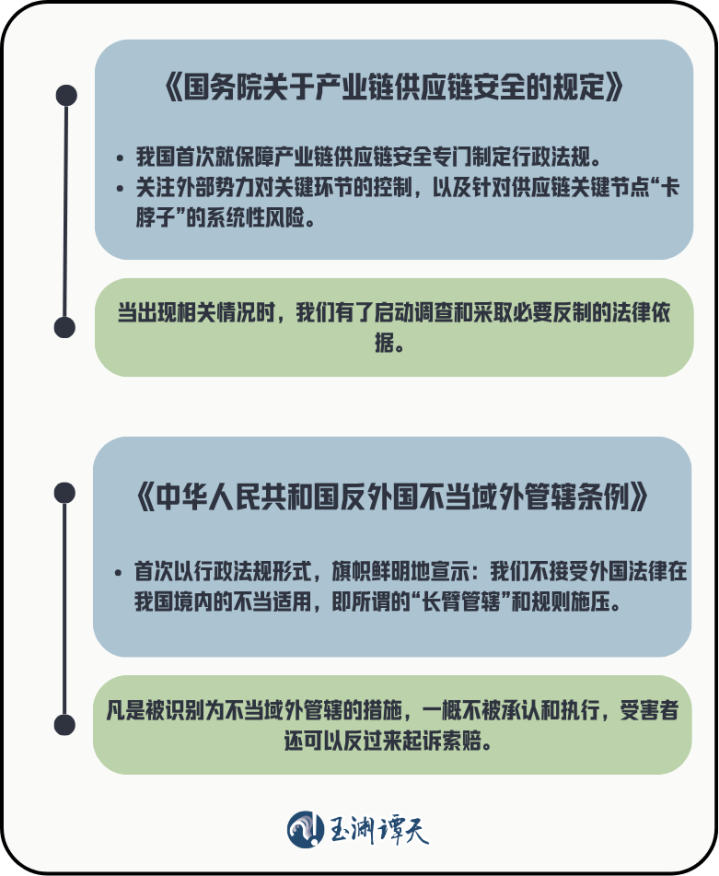 此次出台的两部法例与《反异邦制裁法》《实施〈反异邦制裁法〉的端正》《不可靠实体清单端正》等形成连结互补,构建了以《反异邦制裁法》及实施端正和《反不妥统领条例》为基石,以两部部门法例为维持,加上其他法律条件为侧翼的完好体系。